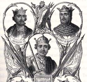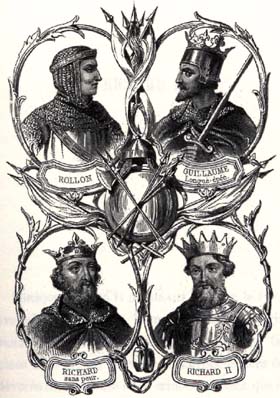 LES ANCÊTRES Depuis le début du IXème siècle les pirates Viking, venus du Nord (de Scandinavie) "les Normands" envahissent l'Europe, dont la France. Le Roi de France, le Carolingien Charles le Simple, finit par convenir, en 911, d'un accord avec Rollon (appelé traité de Saint-Clair sur Epte) par lequel celui-ci reconnaît le Roi comme suzerain mais devient duc de Normandie... avec les terres y attenant (autour de Rouen) mais que lui-même et ses successeurs agrandiront jusqu'en 1065 et qui constitueront la Normandie. La dynastie se continuera avec Guillaume Longue épée, Richard Ier, Richard II, Richard III, Robert Ier le Magnifique dont le fils sera Guillaume le Conquérant. Voir "portraits" ci-dessous |