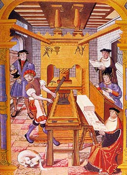 C'est le développement de l'Imprimerie qui va donner son essor à la Littérature. - Voir sur ce même site : L'aventure du Livre (dans "Arts et Techniques"). - D'abord imités des manuscrits pour leurs textes et leur présentation ils vont bientôt se diversifier et ne plus se contenter d'écrits religieux mais s'ouvrir aux traductions (souvent commentées) des auteurs grecs et latins, à la philosophie, la science, la poésie, le roman, etc... D'abord écrits en Latin ils seront de plus en plus rédigés en Français, particulièrement après l'Edit de Villers-Cotterêts (François Ier, 1539) qui recommande l'usage du Français pour les textes officiels ... Leur diffusion sera le fait des imprimeurs-libraires, dont certains seront poursuivis pour la publication de textes dits "hérétiques" (Robert Estienne, Etienne Dolet). L'Eglise est d'autant plus susceptible sur ce point que vient de débuter la Réforme protestante (prônée par Luther et Calvin ). L'illustration est réalisée par des gravures sur bois puis, plus finement, sur cuivre. |