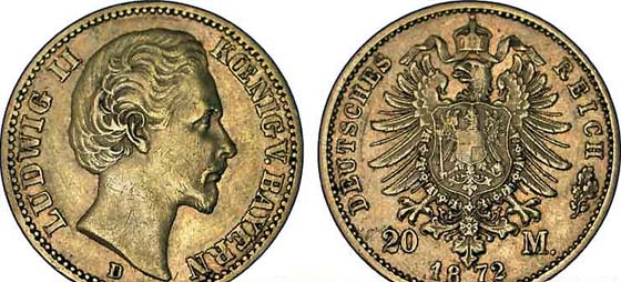 ![]() 20 Marks Or à l'ffigie de Louis II et aux armes du royaume de Bavière |