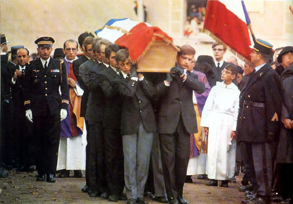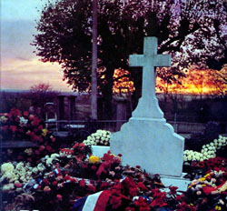 C'est la stupeur en France. Le lendemain tous les journaux français, et beaucoup de journaux étrangers, font leur Une de cette disparition. ![]() C'est seulement revêtu de son uniforme de Général, recouvert d'un drapeau tricolore, à ses pieds le grand collier de l'Ordre de la Libération, qu'il repose à La Boisserie avant d'être inhumé au cimetière de Colombey 3 jours après. Le 12 Novembre 1970, à 15h le cercueil de chêne clair, porté par 12 jeunes de Colombey, fait son entrée à l'église. A 16h15 le corps du Général repose dans la terre de Colombey , entouré de sa famille et de ses plus fidèles Compagnons. Toutes les églises de France ont sonné le glas en même temps que celle de Colombey et, au même moment, se déroule à Notre-Dame de Paris une céromonie religieuse à laquelle participent quelque quatre-vingts Chefs d'Etat et de Gouvernement. |
