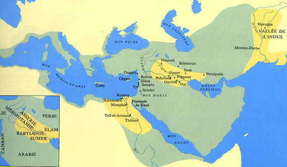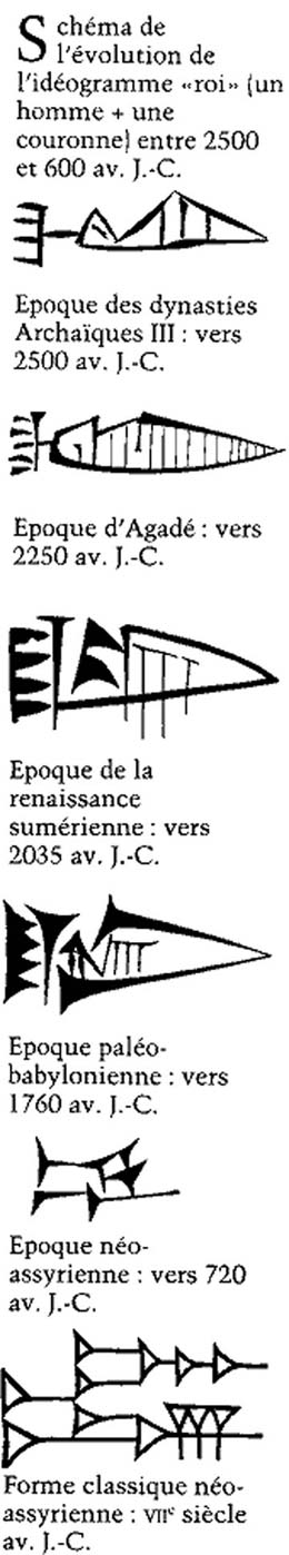 Les SUMERIENS et l'Ecriture cunéiforme (signes composés de coins, car tracés, au début, avec un stylet ou calame en roseau à pointe biseautée, sur des tablettes d'argile) Au départ, simples pictogrammes, puis, de plus en plus élaborés, idéogrammes, preuve de la démarche intellectuelle des hommes vers l'abstraction. ![]() |