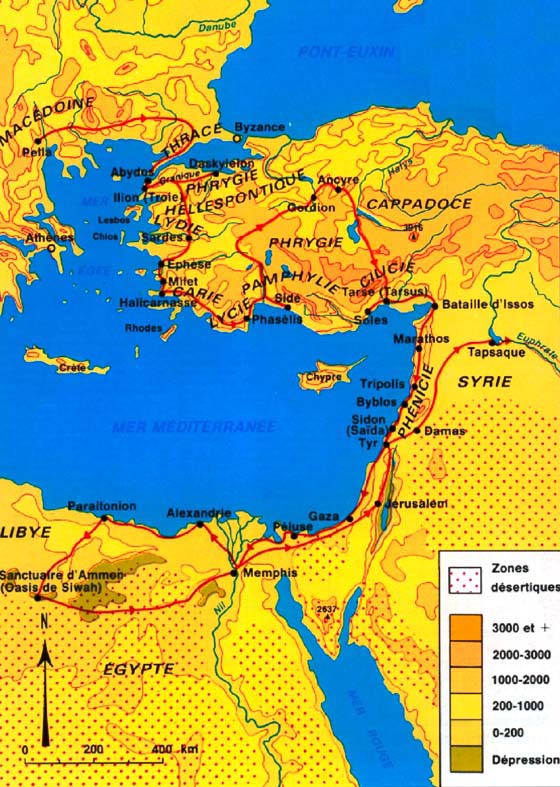 Né à Pella, en Macédoine (au nord de la Grèce), Alexandre devient Roi à 20 ans, en -336, après l'assassinat de son père, Philippe. Après avoir vaincu la révolte de certaines cités grecques auparavant soumises à Philippe, il reprend à son compte l'expédition prévue par son père : reconquérir, en Asie mineure (actuelle Turquie) les cités fondées par les Grecs et conquises par les Perses. En -334 il traverse l'Hellespont et remporte la victoire de Granique (voir carte ci-dessous). Puis il reconquiert Ephèse, Priène, Milet, Halicarnasse, Gordion, Tarse et Issos (cette dernière sur le Roi des Perses, Darius qui s'enfuit). Puis il prend les villes phéniciennes de Byblos, Sidon et Tyr. La route de l'Egypte lui est ouverte... |