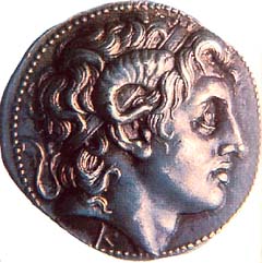 Selon son habitude, il confirme dans leurs titres les nobles du pays et lorsqu'il repart en campagne, en -331, il confie l'Egypte à un gouverneur égyptien... mais laisse sur place des grecs et macédoniens dont les chefs ont le véritable pouvoir. A gauche, une monnaie représentant Alexandre avec les cornes de bélier du dieu Amon. |