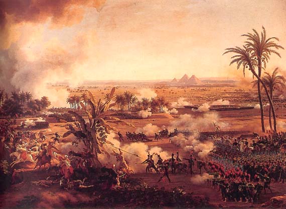 Sous Louis XV et Louis XVI, il avait été envisagé, pour des raisons commerciales et politiques, d'entreprendre la conquête de l'Egypte qui dépendait alors officiellement de l'empire Turc, mais qui s'en était plus ou moins détachée. D'autres problèmes, financiers et politiques, puis l'aide pour l'Indépendance des Etats-Unis... et enfin la Révolution de 1789, l'empêchèrent. En 1798, la France étant en lutte contre l'Angleterre, le Directoire souhaiterait un débarquement sur les côtes anglaises. Le projet étant trop risqué, on se rallie à un autre projet consistant à nuire aux Anglais en Orient, où il sont la puissance occidentale dominante : conquérir l'Egypte. L'expédition, préparée en secret, est confiée au jeune général Bonaparte (que l'on est pas fâché d'éloigner des alentours du pouvoir... lequel est ravi d'aller conquérir la gloire ailleurs, en préparant son retour !) |
