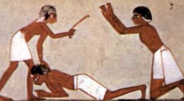 La Justice est sévère mais très réglementée ; une des peines les plus courantes est, suivant la gravité de la faute, la bastonnade. La peine de mort est surtout appliquée lors de délit contre la Religion ou contre Pharaon. Le statut des femmes est équitable ; elles ne sont pas automatiquement soumises à leurs maris ; en cas de divorce elles récupèrent leur part des biens. De nombreux médecins soignent les malades par des traitements par les plantes appris dans les "maisons de vie". Il y a aussi d'excellents chirurgiens comme on a pu le constater à l'examen des momies. |