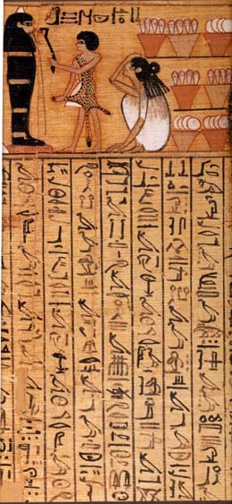 Dans sa main droite il tient le calame (tige de roseau taillée); à proximité il a sa palette creusée de plusieurs godets qui reçoivent les encres noire et rouge. Devant lui il tient ou pose le papyrus sur lequel il va écrire. Celui-ci a été fabriqué par des artisans spécialisés avec des tiges de pâpyrus (roseau) taillées en fines lamelles collées en couches perpendiculaires, aplaties, lissées et sèchées. Souvent on relie entre elles les feuilles ainsi obtenues pour en faire des rouleaux. Cette fabrication étant délicate revient cher et le papyrus n'est pas employé pour l'usage courant. On utilise souvent des tessons de poteries (ostraca) sur lesquels on grave avec un stylet. C'est grâce aux hiéroglyphes gravés ou peints dans les temples et les tombeaux ainsi qu'à ceux des papyrus retrouvés dans les tombeaux que nous avons connaissance de l'Histoire et de la Vie de l'Egypte ancienne ... encore fallait-il pouvoir les lire ! A ce propos voir : Champollion et les hiéroglyphes. |