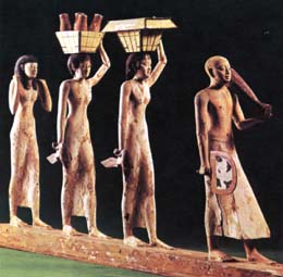 Les Prêtres sont très nombreux (beaucoup de dieux). La hiérarchie est importante : simples participants, officiants "secondaires" très diversifiés, grands prêtres du dieu. Pharaon est le premier de tous mais il délègue à un grand prêtre pour les dieux les plus importants. Amon étant primordial le grand prêtre d'Amon est un très puissant personnage. Ils demeurent dans le pourtour du temple et sont propriétaires de domaines donnés par Pharaon. Ils sont reconnaissables à leur crâne rasé (comme tout leur corps) et sont vêtus d'un simple pagne de lin immaculé. Pour les cérémonies les plus importants d'entre eux coiffent une perruque et revêtent une peau de panthère symbole de leur puissance. ![]() Porteurs d'offrandes au Temple |