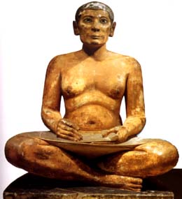 Le scribe est un des personnages essentiels de l'Egypte ancienne. Tous les fonctionnaires, du simple contrôleur des récoltes au ministre, sont passés par les "maisons de vie" où l'on apprend l'art difficile de l'écriture . Les études sont plus ou moins longues selon la qualification du personnage. Pharaon est le premier des scribes, capable de lire et d'écrire les hiéroglyphes (écriture sacrée). |