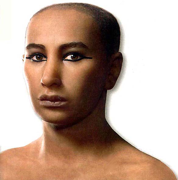 En Janvier 2005, la momie du jeune pharaon a de nouveau subi une batterie de tests radiographiques : quelques 1700 tomographies tridimensionnelles ! Ces nouveaux examens, travaillés par ordinateur, ont permis de constater que la fracture du crâne(révèlée précédemment) était probablement due à de mauvaises manipulations de la dépouille lors de son embaumement (à moins que ce ne soit lors de sa découverte par Carter ?) De plus, on a confirmé une fracture du fémur gauche, accident (de chasse) probable survenu au pharaon "vivant" qui, la gangrène s'y étant mise, aurait été la véritable cause du décès du roi... Mais l'intérêt essentiel de ces travaux aura été de reconstituer, virtuellement d'abord, puis en résine et finalement un modèle sculpté par Elisabeth Daynes qui révèle ce que devait être, probablement (?) le véritable visage de Toutankhamon. |