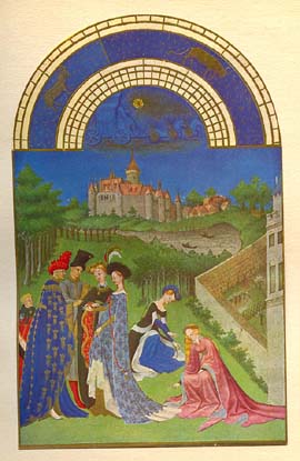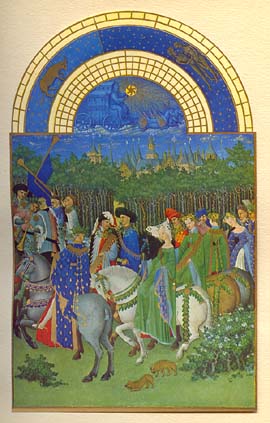 * * * Zodiaque : Taureau, Gémeaux MAI C'est la fête de l'amour qui se célèbre par des réjouissances et des cavalcades. Il est de tradition de se parer de vert : feuillages... et manteaux ! Derrière la forêt que traverse le cortège princier on aperçoit la ville de Riom, capitale du duché d'Auvergne, fief de Jean de Berry. * * * |