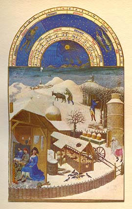 * * * Zodiaque : Verseau, Poissons FEVRIER Dans un paysage de campagne enneigée la vie d'une ferme près d'un village vers lequel se dirige le paysan avec son âne. A droite un bûcheron abat un arbre. Dans l'enclos un pigeonnier et des ruches. Les moutons se serrent dans la bergerie. Devant des pies picorent quelques grains. . Dans la salle de ferme trois personnages se chauffent devant le feu. * * * |