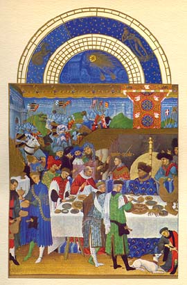 * * * Zodiaque : Capricorne, Verseau JANVIER Assis, à droite, Jean de Berry devant une table bien servie par des écuyers, au premie plan. Près de lui l'évêque de Chartres, son conseiller. Derrière la table les invités qui arrivent sont accueillis par le Chambellan. En fond une tapisserie une tapisserie avec des chevaliers partant en guerre. * * * |