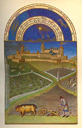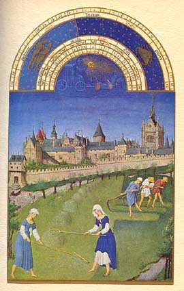 * * * Zodiaque : Gémeaux, Cancer JUIN Nous sommes à Paris, sur la rive gauche de la Seine. Des paysans travaillent sous le soleil. Vu de l'hôtel de Nesle, résidence parisienne de Jean de Berry, le Palais de la Cité. A droite la Sainte-Chapelle édifiée par Louis IX (Saint-Louis). Cette vue est la plus ancienne que nous ayons de cet endroit. * * * |