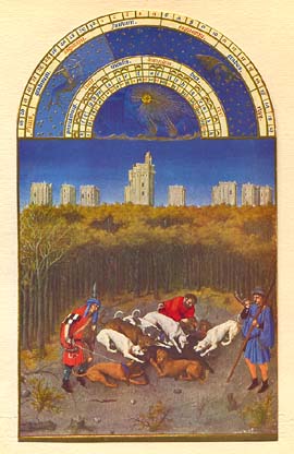* * * Zodiaque : Sagittaire, Capricorne DÉCEMBRE Dans le fond le château de Vincennes où Jean de Berry était né. Les arbres perdent leurs feuilles jaunies. Les chasseurs viennent d'abattre un sanglier, les chiens se précipitent ; c'est l'hallali. L'un sonne du cor pour avertir le reste du groupe de se rassembler. * * * |