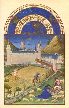 * * * Zodiaque : Cancer, Lion JUILLET A Poitiers, capitale du Poitou, comté donné par Charles V à son frère Jean de Berry, le château reconstruit par ce dernier. Dans les champs environnants les paysans font la moisson et les bergers tondent les moutons. * * * |