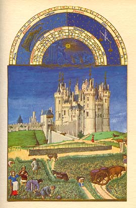 * * * Zodiaque : Vierge, Balance SEPTEMBRE Le château de Saumur. Ce sont les vendanges. Ce tableau étant inachevé fut terminé par Jean Colombe, du moins pour les personnages au premier plan. * * * |