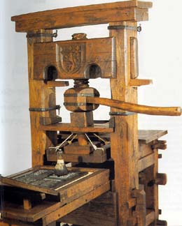 LA " RÉVOLUTION " DU LIVRE La Xylographie (procédé d'impression par gravure sur bois)permettait, depuis longtemps, l'impression de motifs sur des étoffes. Dès le XIV°siècle cette technique s'étend à la reproduction d'images pieuses ... et de cartes à jouer. Mais elle était, évidemment, difficilement applicables pour l'impression des textes. Il semble qu'en Chine, on ait déjà inventé les caractères d'écriture "individuels", donc mobiles, afin d'imprimer des pages. Cette technique finira pas se répandre aussi en Occident, mais elle est très longue, difficile ... et le bois s'use vite. |