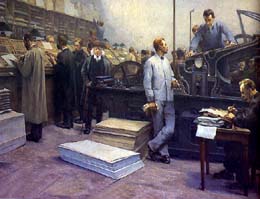 C'est d'abord la mécanisation de la fabrication du papier avec de la pâte à bois, produit maintenant en rouleaux et blanchi au chlore. On invente l'encrage automatique et les presses mécaniques qui succèdent, peu à peu, aux presses manuelles. La Lithographie (gravure sur pierre) permet l'impression à plat, de même que la gravure sur cuivre ou acier, techniques employées par Goya, Delacroix, Daumier, ... pour l'illustration en "hors-texte" de nombreux ouvrages d'Art. |