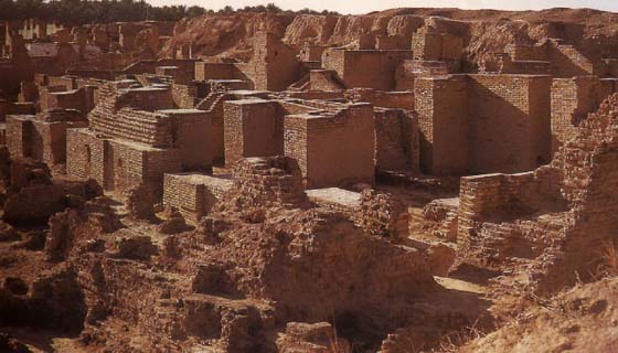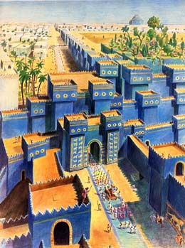 C'est au cours de la seconde moitié du troisième millénaire avant J-C que commence l'histoire de Babylone. Au début du second millénaire c'est déjà le centre d'un empire qu'Hammourabi va consolider en imposant son dieux Mardouk, et le célèbre code qui porte son nom. Mais c'est sous le règne de Nabuchodonosor, de -605 à -562 que Babylone est à son apogée. Laissons-lui la parole à propos de la porte d'Ishtar (une des 100 porte de la ville dont parle Hérodote) : " Je la revêtis de briques émaillées en bleu sur lesquelles étaient représentés des taureaux sauvages et des dragons. Je fis poser au-dessus pour la couvrir des poutres de cèdre. Je plaçai dans ses portes des vantaux recouverts de cuivre, des gonds et leurs supports en bronze... j'embellis cette porte afin de faire l'admiration de tous les peuples. " Cette porte débouchait sur une voie processionnelle, sur une longueur de 300m, large de de 22m, par des murs décorés de briques bleues et de lions, symboles de la déesse Isthar, conduisant au temple de Mardouk. De nombreux autres édifices, dont le palais d'été et un pont gigantesque enjambant l'Euphrate, embellissaient la ville. |