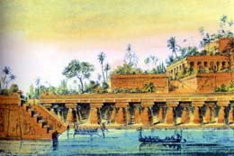 Ce serait pour sa fiancée Amytis, fille du roi des Mèdes, que Nabuchodonosor, fit réaliser ces jardins. Sur l'angle nord du palais, on les apercevait hors de la ville, comme suspendus entre ciel et terre... d'où leur légendaire histoire. Ce n'est qu'à la fin du XIXème siècle que l'archéologie allait prouver l'existence de cette merveille décrite dans l'Antiquité par Hérodote, Diodore de Sicile, Stabon et Quinte Curce. Installés sur une terrasse, à 20m du sol, formant un trapèze dont le plus grand côté mesurait 45m, ils étaient irrigués par plusieurs puits... et probablement entretenus par un grand nombre d'esclaves. On imagine qu'ils étaient ornés par des palmiers dattiers, des pins, des cyprès, des cèdres, ... et de nombreuses espèces de fleurs exotiques. |