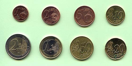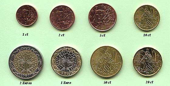 A compter du 1er Janvier 1999 onze pays d'Europe décident d'adopter une "monnaie commune". Cette réforme monétaire entre en application le 1er Janvier 2001. C'est la naissance de l'EURO. Les pièces ont toutes une face commune avec leur valeur ; l'autre face est nationale avec des thèmes différents pour chaque pays. Les pièces de 1, 2, 5 Centimes sont en cuivre rouge. Les pièces de 10, 20, 50 Centimes sont en alliage sans nickel, dit "or nordique". Les pièces de 1 et 2 Euros sont bimétalliques et bicolores. |