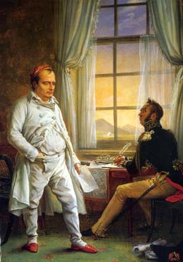 Le 20 Avril 1814, Napléon quitte Fontainebleau pour l'ile d'Elbe dont le traîté de Paris lui assure la souveraineté. Louis XVIII, frère de Louis XVI rentre à Paris le mois suivant, c'est "la Restauration". Mais l'Empereur déchu s'ennuie très vite dans ce mini Royaume (proche de la Corse) qu'il a vite organisé. Comme il a encore de nombreux partisans en France il décide d'y revenir et après ce court séjour (4 Mai 1814-26 Février 1815), trompant la surveillance anglaise, il s'embarque secrètement pour le continent où il va débarquer à Golfe Juan (près de Cannes), le 1er Mars 1815. |