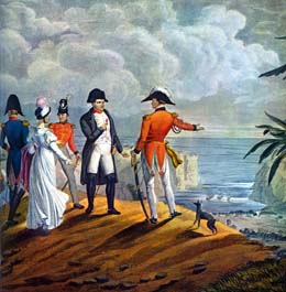 Le 15 juillet, à Rochefort, il se met sous la protection des Anglais dont il "sollicite l'hospitalité" et monte à bord du Bellérophon qui fait voile pour Plymouth. C'est là qu'il apprend qu'il sera déporté à Sainte-Hélène, petite ile tropicale de l'Atlantique sud, non plus comme souverain de l'ile mais comme prisonnier de l'Angleterre. Il y aborde le 17 Octobre 1815. Il a la permission d'emmener seulement quelques compagnons, tels Montholon, Las Cases, Bertrand et leurs familles. ![]() ![]() Les généraux Bertrand et Montholon |