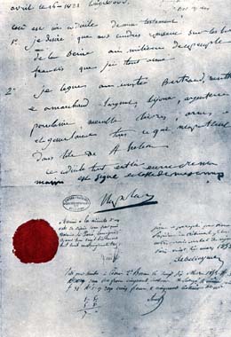 Samedi 5 Mai 1821, 5h 49mn Napoléon vient de mouris. Il est veillé par le général Bertrand et son épouse, le comte de Montholon, le docteur Antommarchi ainsi que par son fidèle valet de chambre Marchand. A droite ---> extrait du testament de Napoléon |