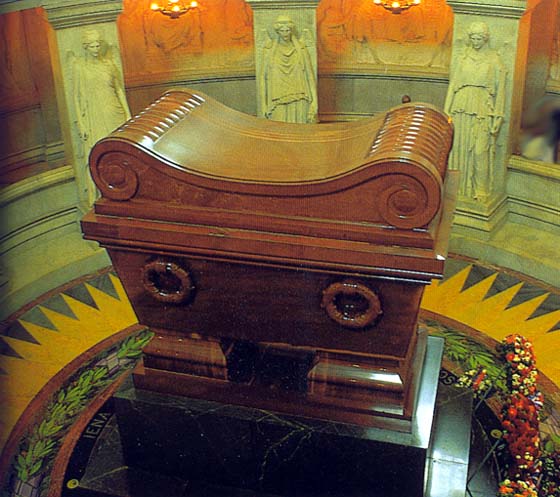 ![]() Le tombeau de Napoléon, dans la crypte de Saint-Louis des Invalides (Oeuvre de Visconti, tombeau en porphyre rouge sur un socle en granit vert) |