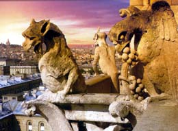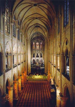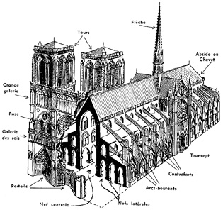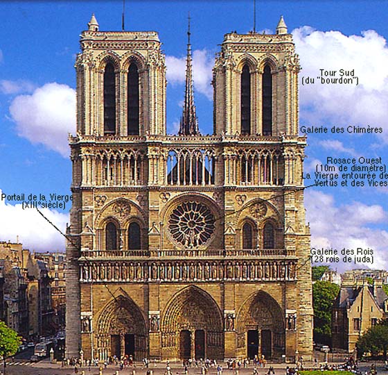 A l'époque romaine, à cet emplacement, sur l'île de la Cité, s'élevait peut-être déjà un temple qui pourrait avoir aussi été lié aussi à un ancien culte gaulois (?). Au V°siècle, sur ses ruines fut bâtie la basilique Saint-Etienne, agrandie aux VI° et VII°siècles sous le vocable Notre-dame , détruite au début du IX°siècle par les Normands et reconstruite quelques années plus tard ! En 1163, sous le règne de Louis VII, l'évêque Maurice de Sully demande au pape Alexandre III de poser la première pierre d'une nouvelle cathédrale. Aux alentours de 1200, la cathédrale est entièrement voûtée en arcs d'ogives (nouveauté par rapport aux précédents arcs romans), mais la fragilité des murs, la voûte s'élevant à 35m, oblige à une nouvelle innovation, ce sont les arcs boutants. Vers 1220, la cathédrale s'élève jusqu'à la "galerie des rois". En 1250, les tours sont achevées. Ce n'est qu'un peu avant le milieu du XIV°siècle que l'édifice est achevée. Au XIX°siècle la cathédrale, victime en particulier de la Révolution, menace ruine. Louis-Philippe confie à Viollet-le-Duc sa restauration. Entres autres choses, la flèche est refaite et portée à 90m de haut., les statues et portails de façades restaurés. |