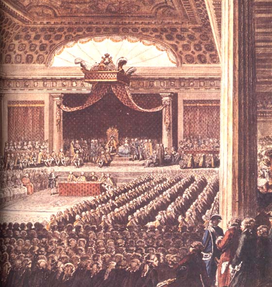 Dès son accession au trône, en 1774, LOUIS XVI, véritablement soucieux du bonheur de son peuple, souhaite des réformes et nomme TURGOT Contrôleur général des Finances. Celui-ci entreprend d'abaisser les dépenses de l'Etat, d'éviter la fraude des Fermiers généraux (percepteurs des impôts) et de réduire les droits seigneuriaux qui affament les paysans. Malheureusement de mauvaises récoltes successives provoquent des soulèvements et, opposés aux réformes, les "privélégiés" (Noblesse, haut-Clergé et Parlements) obtiennent son renvoi. En 1776, le Roi le remplace par NECKER. Celui-ci, pour renflouer l'Etat, multiplie les emprunts qui alourdissent la Dette publique déjà très aggravée par l'aide à la guerre d'Indépendance américaine. Comme TURGOT il s'attaque aux privilégiés et doit aussi démissionner, en 1781. De mauvaises conditions climatiques et leurs conséquences économiques ne permettent pas à CALONNE ni à LOMÉNIE de BRIENNE qui lui succèdent de redresser la situation financière. De plus, les idées libérales des philosophes gagnent du terrain dans toutes les Classes sociales. Les Parlements de Province s'associent à celui de Paris, en lutte contre le pouvoir royal, pour réclamer la convocation des Etats-Généraux, réunissant les 3 "ordres" : Clergé, Noblesse, Tiers-Etat, qui ne l'ont pas été depuis 1674 (sous la Régence de Marie de Médicis pour LOUIS XIII). Le Roi accepte et décide leur convocation pour le 1er Mai 1789. Dans toute la France, les députés élus rédigent les "cahiers de doléances". Ceux du Tiers-Etat réclament le "vote par tête"; le Clergé et la Noblesse s'y opposent. Le Roi accorde le doublement du nombre des députés du tiers-Etat ... ne satisfaisant ainsi personne. ![]() Ouverture, à Versailles, des Etats-généraux, le 5 Mai 1789 |