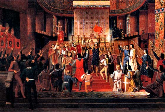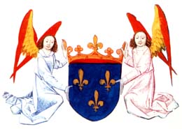 mais surtout par les Carolingiens. Elle serait issue soit de la forme du javelot gaulois, soit de celle de l'iris ou du lys (symbole de pureté, fleur de la Vierge Marie), ..., dite aussi fleur de "Louis" car choisie par Louis VII en 1147 comme symbole de la monarchie capétienne. Au 13ème siècle Philippe III la réduit à 3 sur le sceau royal. Après avoir été en "semé" sur l'écu, les armes des Rois de France deviennent "3 fleurs de lys d'or sur fond d'azur". |