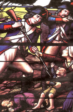Et ce fut le carnage annoncé comme en témoignent les rapports des généraux républicains qui commandaient les Colonnes. En voici quelques extraits : "... Nous en tuons près de 2000 par jour... J'ai fais tué (sic) ce matin 53 femmes, autant d'enfants... J'ai brûlé toutes les maisons et égorgé tous les habitants que j'ai trouvés. Je préfère égorger pour économiser mes munitions..." Quelque exemples d'atrocités : CORDELLIER arrive à Clisson ; il trouve, dans une salle en ruines du château, 300 paysans qu'il fait jeter, vivants, dans une citerne, qu'on comble de fagots et de planches. Le même CORDELLIER arrive aux Lucs-sur-Boulogne . Hommes, femmes et enfant se sont réfugiés dans la petite église ou à proximité. Sabres , baïonnettes, pics,... frappent, égorgent, éventrent, écrasent... Le canon fait écrouler la modeste église sur ses occupants. 458 noms de ces martyrs sont connus, dont 110 enfants de moins de 7 ans. A force de tueries, des municipalités, pourtant républicaines, et des Représentants du Comité de salut public finissent par s'émouvoir. TUREAU est relevé de ses fonctions en Mai 1794, puis décrété d'arrestation en Septembre. Jugé en Décembre 1795, il est acquitté à l'unanimité ! Son action avait fait près de 200000 victimes. |